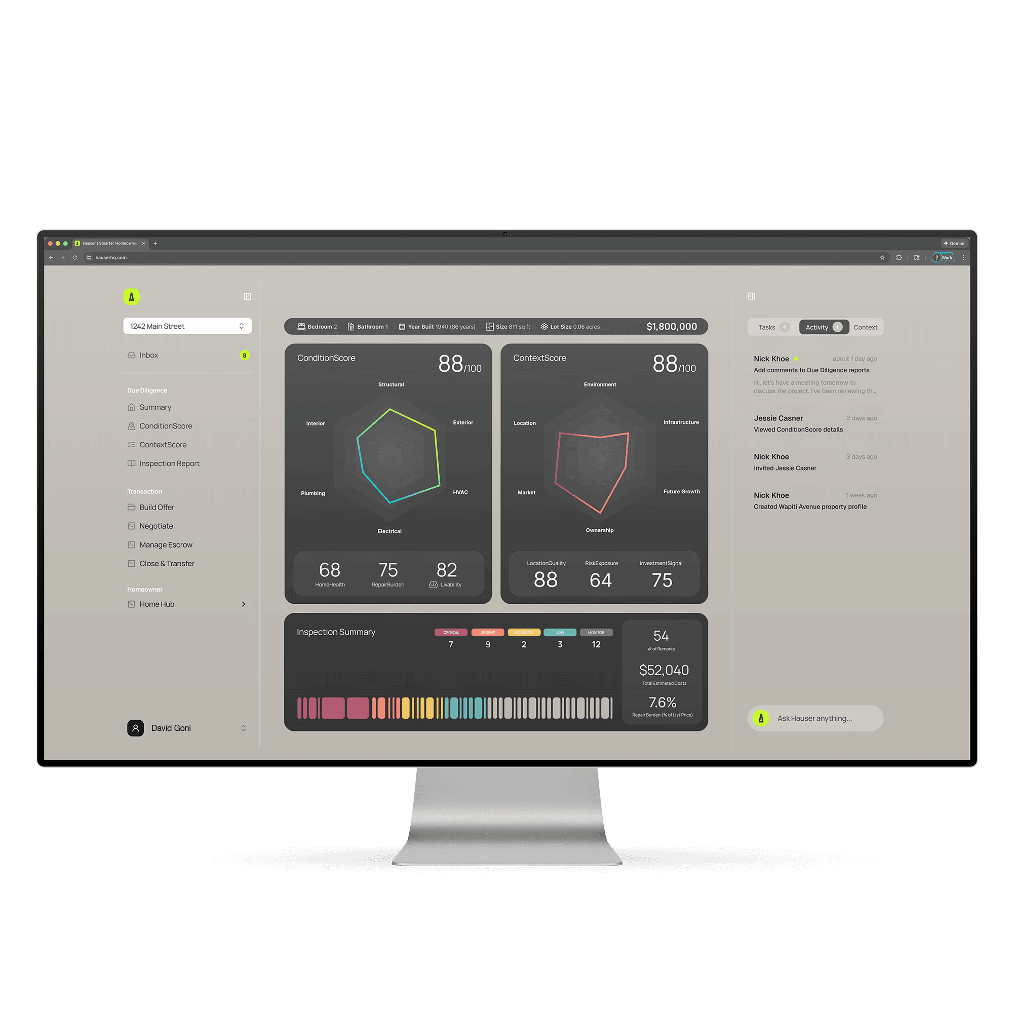 Every issue with the property—structure, systems, permits, past work. Every factor around it—risk, location, market trends. Every cost projected—what's urgent, what can wait, what it means for your offer.